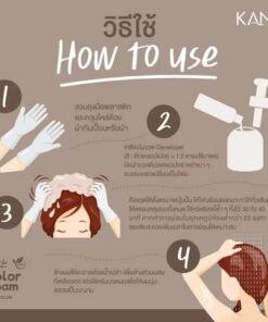 - ถือขวดให้ตั้งตรง กดปุ่มปั๊มให้โฟมออกมา แล้วชโลมให้ทั่วเส้นผมจนคลุมผมทั้งหมด ใช้หวีช่วยเกลี่ยหรือขยี้ซ้ำๆ ให้สีซึมทั่ว